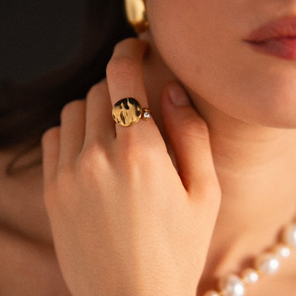 揺れるカットガラスがポイントのリング。